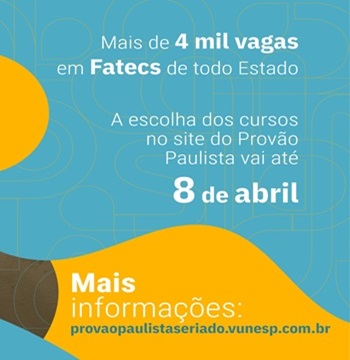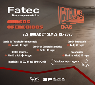 De 07/04 até as 15h do dia 01/06/2026 Inscrições para o Processo Seletivo no site vestibular.fatec.sp.gov.br